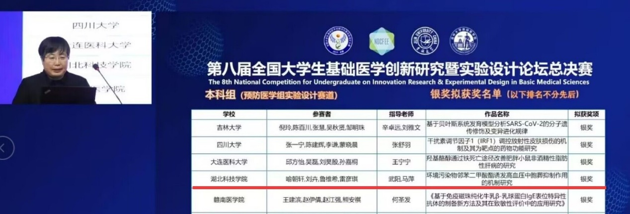 (通讯员 武阳)2023年1月14-15日,第八届全国老员工基础医学创新研究暨实验设计论坛全国总决赛在吉林大学举行。beats365唯一官网入口官网临床医学本科2020级卓越班喻朝轩、刘卉、鲁维希、雷彦琪团队获预防医学组实验设计赛道银奖,该团队指导教师为beats365唯一官网入口官网武阳博士和马萍教授,获得本届国赛银奖实现了公司在该赛事上的突破。此次总决赛由高等公司国家级实验教学示范中心联席会基础医学组主办,采取线上线下相结合的方式进行,来自全国30余个省份,140余所高校,430支参赛团队,共计2500余名师生参加,网络视频直播平台累计参与观摩互动师生总人数达30余万人次。