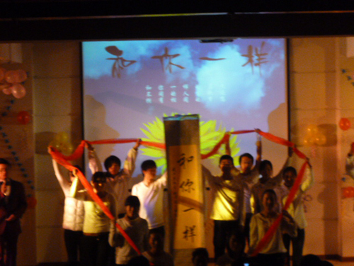 之后,工作人员放映一段来自马桥中学贫困员工生活与学习的短片。全体师生紧盯大屏幕,感受至深,对马桥中学贫困员工充满了同情。此时beats365唯一官网入口官网党总支范彬书记、学工办主任王淑华、副主任周立勇率先慷慨解囊向马桥中学贫困员工捐献爱心。随后一张张带着希望的捐款融入了充满爱心与希望的募捐箱里。范杉书记为11级临床医学本三班颁发了“优秀组织奖”并发表了讲话。范彬书记高度评价了此次主题晚会的重要意义,并表达了对马桥中学贫困员工们深切的祝福与愿望。学工办王淑华主任也清唱了一段经典的《女驸马》,寄予马桥中学贫困员工们衷心愿望。最后,晚会在充满爱心与希望的手语《和你一样》中落下帷幕。
