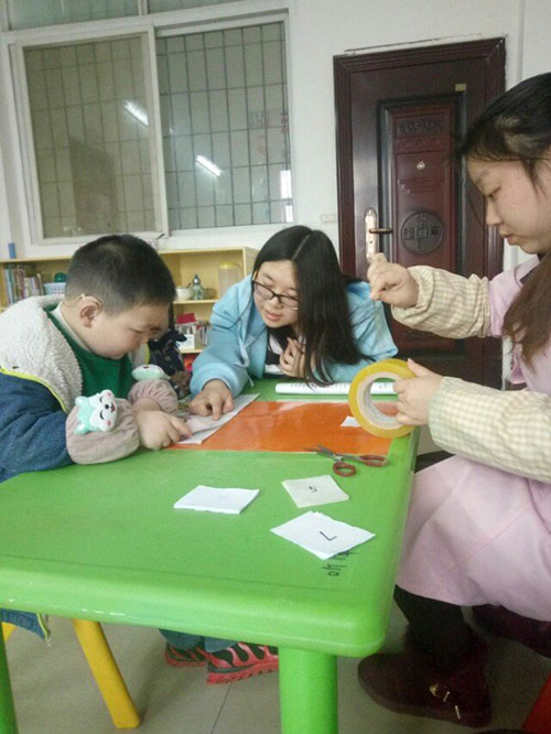 随后志愿者们分成了五个小组,分别在康复中心老师的指导下与孤独症及听障小朋友进行交流。志愿者们拿着玩具尝试着与孩子们接触,并协助老师上课,帮助孤独症的儿童走出自闭的阴影。活动现场还举行了简单的文艺表演,志愿者们纷纷展示出了他们的才艺,唱歌跳舞,为活动更添一分色彩,最后是与孩子们玩躲避球的游戏。在志愿者的耐心付出与康复中心老师的大力协助下,这次学雷锋活动圆满结束。