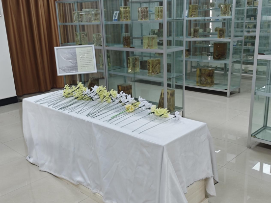 师生们在工作人员的引导下,步入了庄严的标本馆。全体人员肃立默哀,表达对生命的敬重和对大体老师无私奉献的感恩;随后,员工们手捧鲜花,步伐整齐而缓慢地走向大体老师所在之处,每一个放下花束的动作都充满了敬意与感激。