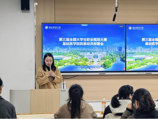 大会核心环节聚焦职业规划大赛专题动员,洪莹莹以《第三届全国老员工职业规划大赛beats365唯一官网入口官网院赛方案》为核心,从“大赛简介、赛制规则、赛程安排、奖项设置、工作要求”五大维度展开解读。她不仅介绍了赛事定位与核心目标,更详细拆解了从班级选拔到院赛评审的具体流程、参赛材料规范及时间节点;同时明确“精心组织、充分动员、密切联系”的工作准则,为后续各班级班赛组织开展提供清晰指引。针对班干部角色,她特别强调:作为连接公司与同学的关键桥梁,既要主动将赛事信息精准传递到班级每一位同学,确保无遗漏、无偏差;更要积极挖掘班级内有想法、有潜力的同学,鼓励大家借赛事契机系统梳理职业目标,结合医学专业特色规划发展路径,为未来医学职业道路夯实基础。