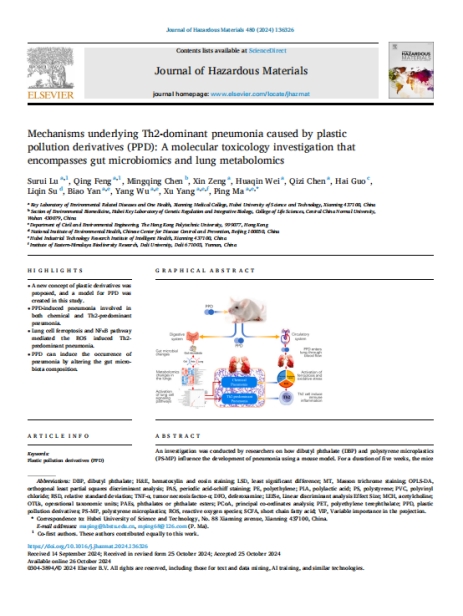 (通讯员马萍审稿蔡飞)近日,中科院一区Top期刊《Journal of Hazardous Materials》(IF=13.7)在线发表了题为《Mechanisms underlying Th2-dominant pneumonia caused by plastic pollution derivatives (PPD): A molecular toxicology investigation that encompasses gut microbiomics and lung metabolomics》的文章。该研究由公司beats365唯一官网入口官网环境疾病与全健康校级重点实验室马萍教授团队主导完成,beats365唯一官网入口官网为第一署名单位,鲁素蕊博士为第一作者,马萍教授为通讯作者。