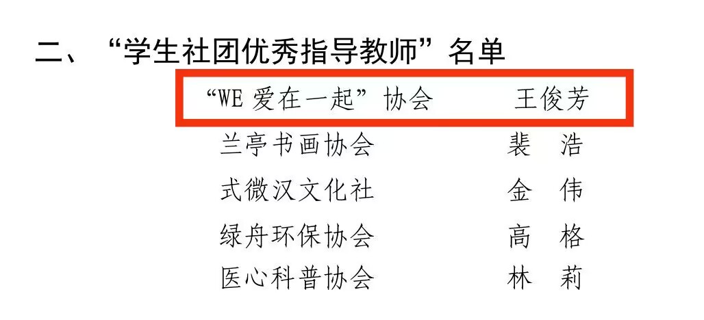 “WE爱在一起”协会指导老师王俊芳获得“员工社团优秀指导教师”的称号。一个协会的蓬勃发展离不开一位优秀的指导老师,在“WE爱在一起”协会成员的心中王老师是一位慈祥的“妈妈”,也是“WE爱在一起”协会的顶梁柱,她工作时严肃认真,但私下对协会的成员则是体贴入微。